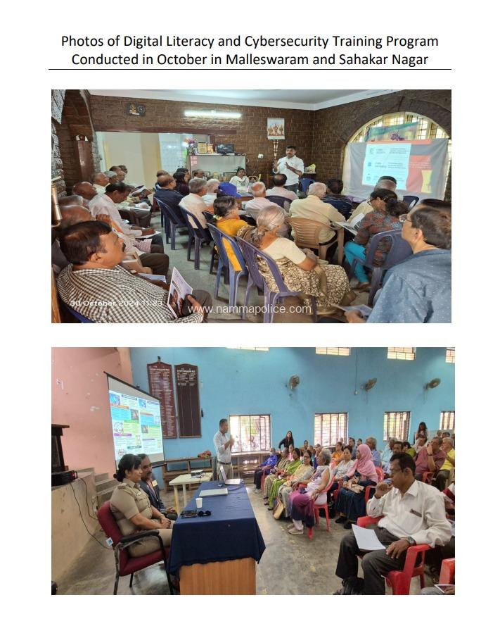 ಅದೇ ರೀತಿ ಅಕ್ಟೋಬರ್ ಮಾಹೆಯಲ್ಲಿ ಮಲ್ಲೇಶ್ವರಂ ಮತ್ತು ಸಹಕಾರ ನಗರದಲ್ಲಿ ಡಿಜಿಟಲ್ ಸಾಕ್ಷರತೆ ಮತ್ತು ಸೈಬರ್ ಸುರಕ್ಷತೆ ತರಬೇತಿ ಕಾರ್ಯಕ್ರಮವನ್ನು ನಡೆಸಲಾಗಿರುತ್ತದೆ. ಈ ಕಾರ್ಯಕ್ರಮದಲ್ಲಿ ಸುಮಾರು 180 ಜನ ಹಿರಿಯ ನಾಗರಿಕರು ಭಾಗವಹಿಸಿ, ಉಪಯುಕ್ತವಾದ ಮಾಹಿತಿಯನ್ನು ಪಡೆದುಕೊಂಡು ಮೆಚ್ಚುಗೆಯನ್ನು ವ್ಯಕ್ತಪಡಿಸಿರುತ್ತಾರೆ.