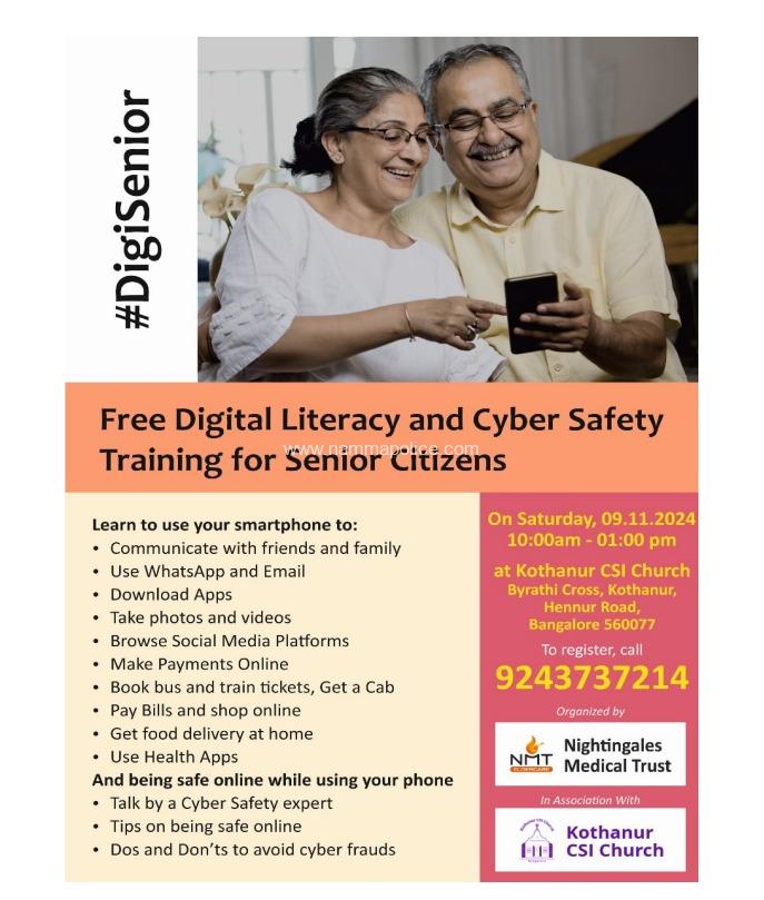 Similarly, on Saturday, November 9, 2024, a training session for senior citizens on digital literacy and cyber-security will be held from 10:00 AM to 1:00 PM at CSI Church, Byrathi Cross, Hennur Road, Kothanur, Bengaluru- 77. All senior citizens are encouraged to take advantage of this opportunity.