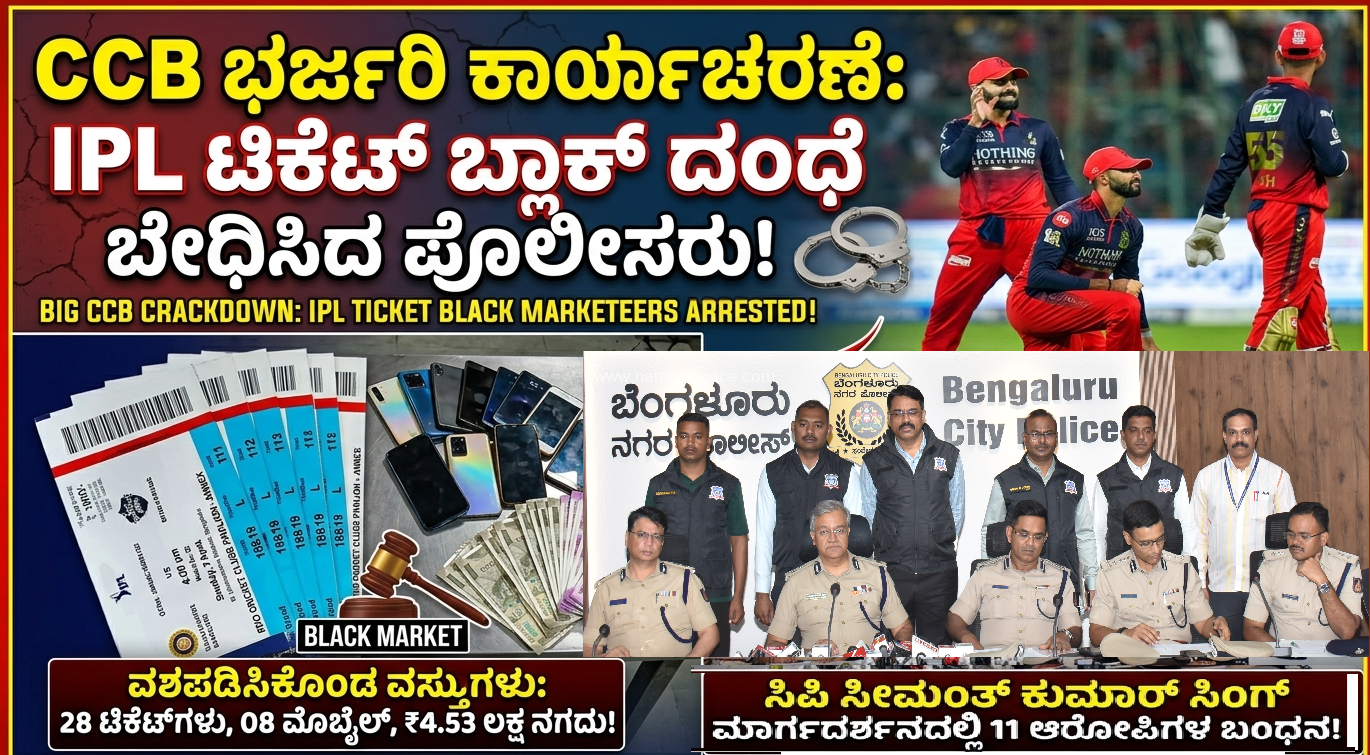 ಬೆಂಗಳೂರಿನ ಚಿನ್ನಸ್ವಾಮಿ ಕ್ರೀಡಾಂಗಣದಲ್ಲಿ ಏಪ್ರಿಲ್ 5 ರಂದು ನಡೆದ ಆರ್.ಸಿ.ಬಿ ಮತ್ತು ಸಿ.ಎಸ್.ಕೆ ನಡುವಿನ ಹೈವೋಲ್ಟೇಜ್ ಪಂದ್ಯದ ವೇಳೆ ಟಿಕೆಟ್ಗಳನ್ನು ಕಾಳಸಂತೆಯಲ್ಲಿ ಮಾರಾಟ ಮಾಡುತ್ತಿದ್ದ ಜಾಲವನ್ನು ಸಿಸಿಬಿಯ ವಿಶೇಷ ವಿಚಾರಣಾ ದಳ ಭೇದಿಸಿದೆ.